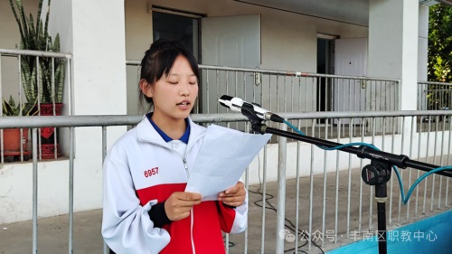 随后,五星级学生代表、24幼儿保育4班张芸畅同学发言。她分享了自己的成长感悟,感谢学校与老师的培养,并倡议全体同学自律自强、勤学苦练,争做德技并修的中职生。