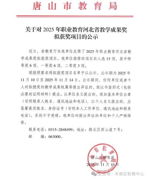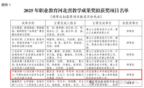近日,河北省职业教育教学成果奖评选结果正式揭晓,丰南区职教中心产教融合处主任翟成宝主持申报的《产教同频·以岗定策·多元成才:中职机电技术应用专业育人体系创新与实践》项目凭借鲜明的办学特色、显著的育人成效和突出的创新价值,荣膺2025年职业教育河北省教学成果特等奖。这一殊荣不仅是对学校机电专业多年教学改革实践的高度认可,更为区域中职教育产教融合改革树立了标杆,实现了学校在省级职业教育最高教学成果奖项上的重大突破!