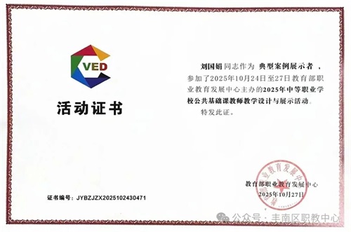 2025年10月24日至27日,由教育部职业教育发展中心主办的2025年中等职业学校公共基础课教师教学设计与展示活动在青岛成功举行。丰南区职教中心(丰南高级技工学校)刘国娟老师凭借其扎实的专业功底、精湛的教学设计和突出的现场表现,其英语学科教学设计作品荣获一等奖。